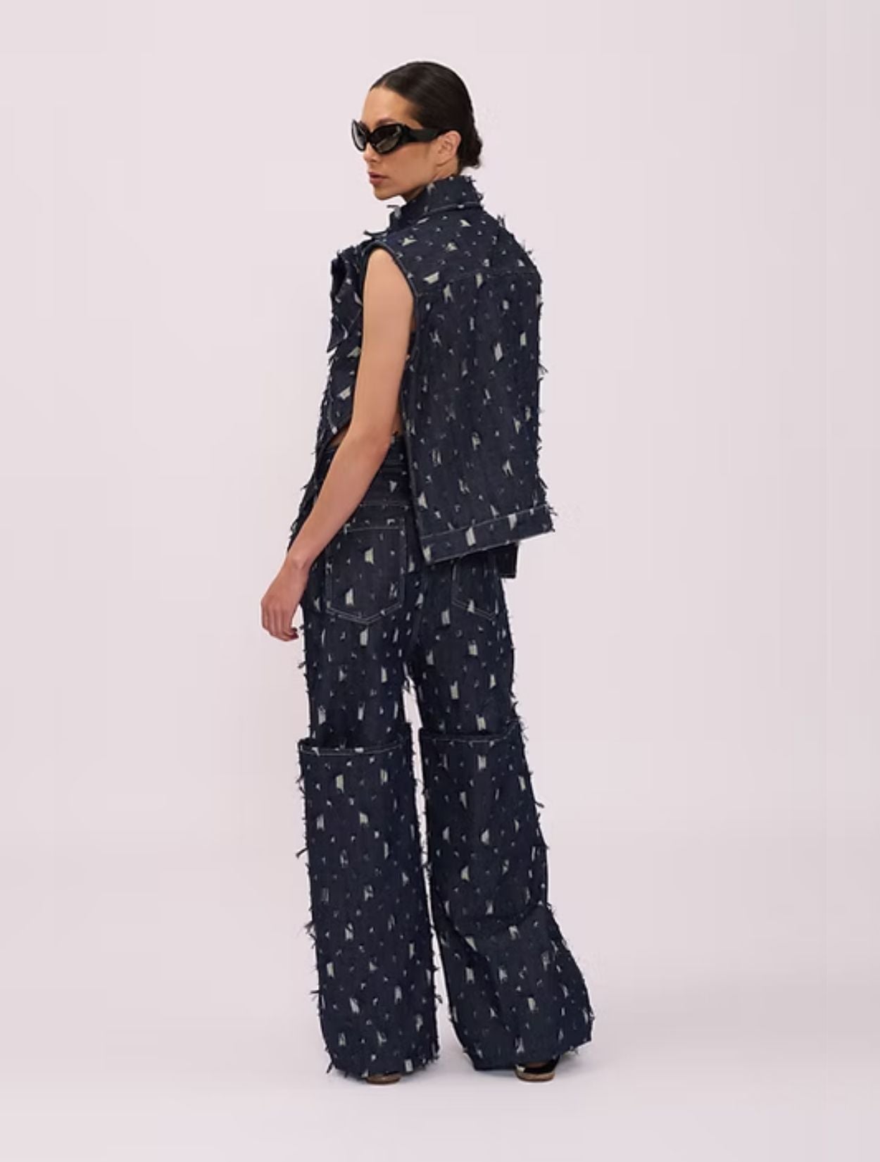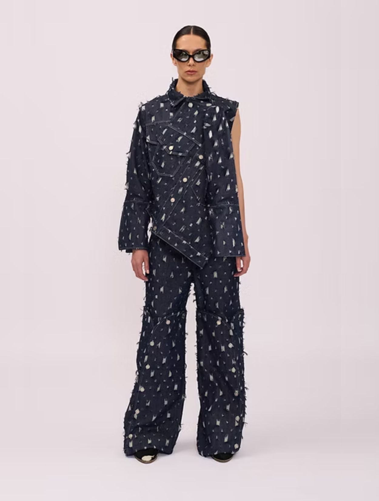 Pantalones de tiro alto y pierna ancha que combinan patrones y texturas eclécticas para un diseño impactante. La base presenta un divertido patchwork de paneles a cuadros e ilustraciones en tonos verdes suaves, lavanda y grises, acentuados con caprichosos motivos de ositos de peluche. Las tiras de mezclilla gris contrastantes recorren verticalmente la parte delantera y central, aportando estructura, mientras que los paneles laterales negros texturizados enmarcan la silueta con un volumen espectacular. Con un cierre frontal abotonado y delicados lazos en la cintura, esta pieza ofrece una combinación única de estructura y fluidez. Esta pieza fue tejida, diseñada, ilustrada, confeccionada y empaquetada por manos colombianas especialmente para ti.