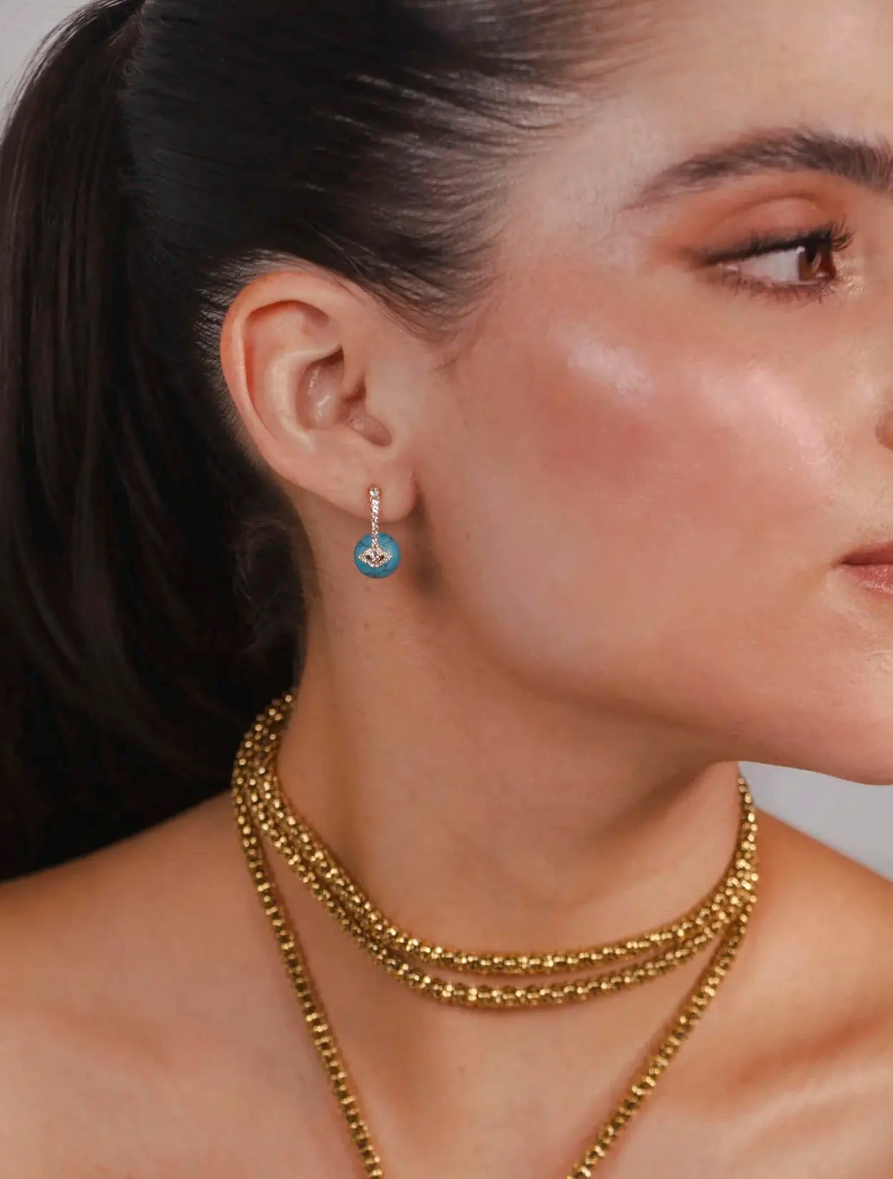 La mezcla entre el brillo de los circones y la intensidad del color turquesa da como resultado una joya moderna, versátil y luminosa, un punto de color elegante y atemporal que eleva cualquier look.