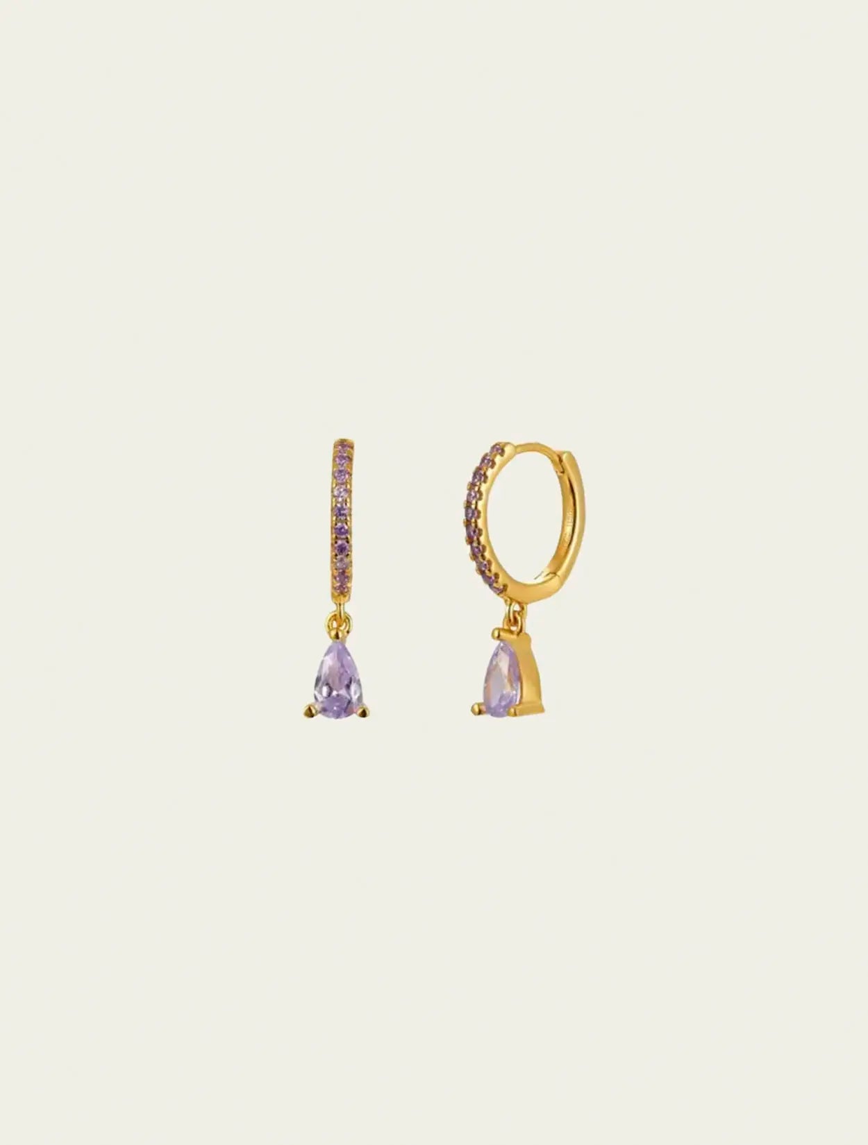 Estos aretes mini candongas combinan una línea delicada de circones lila con una piedra central en forma de lágrima que cuelga suavemente, creando un movimiento sutil y un brillo encantador.