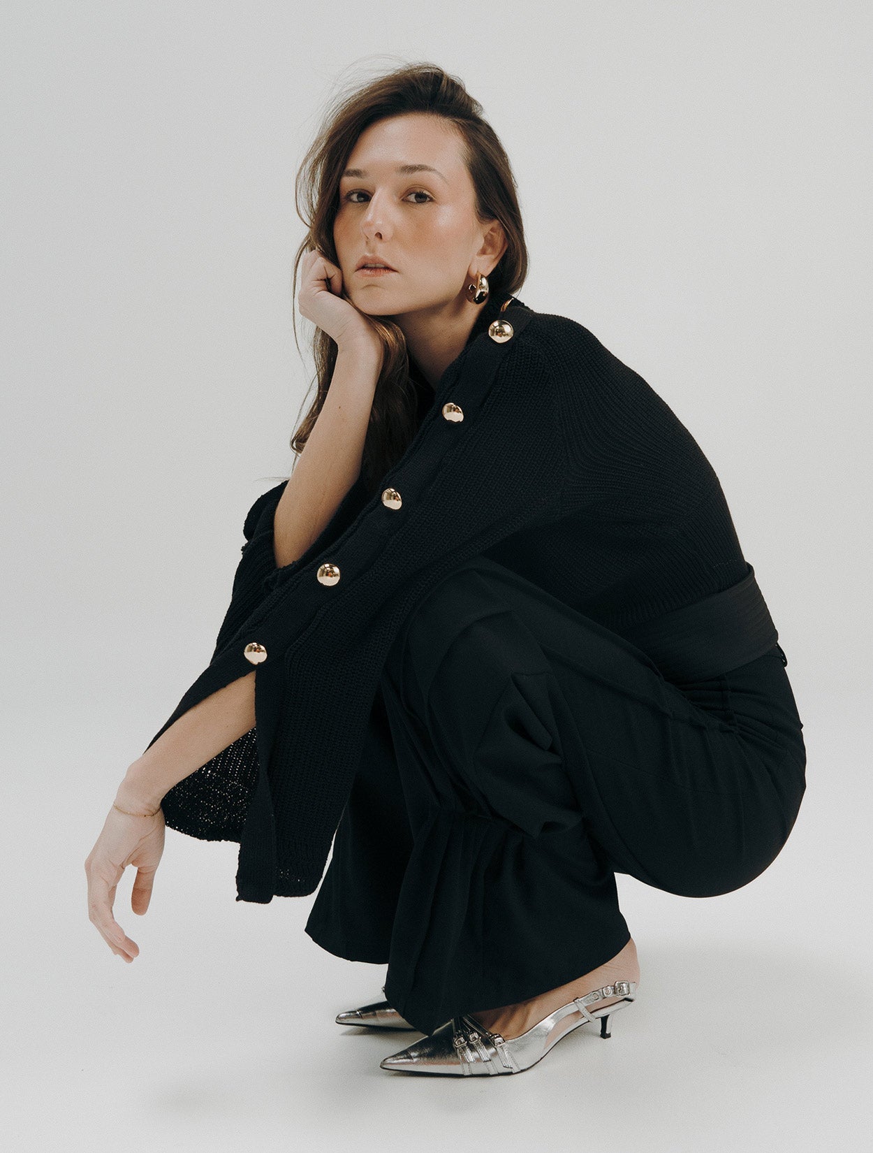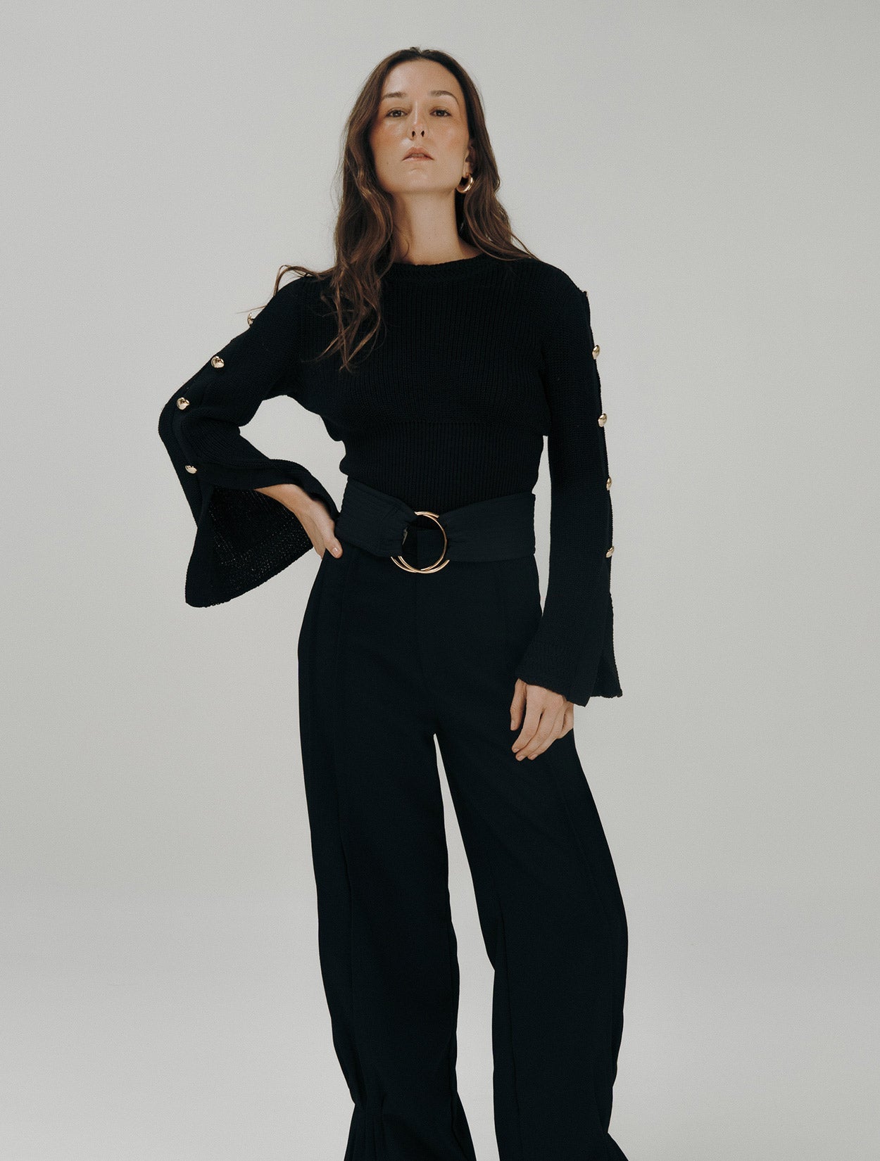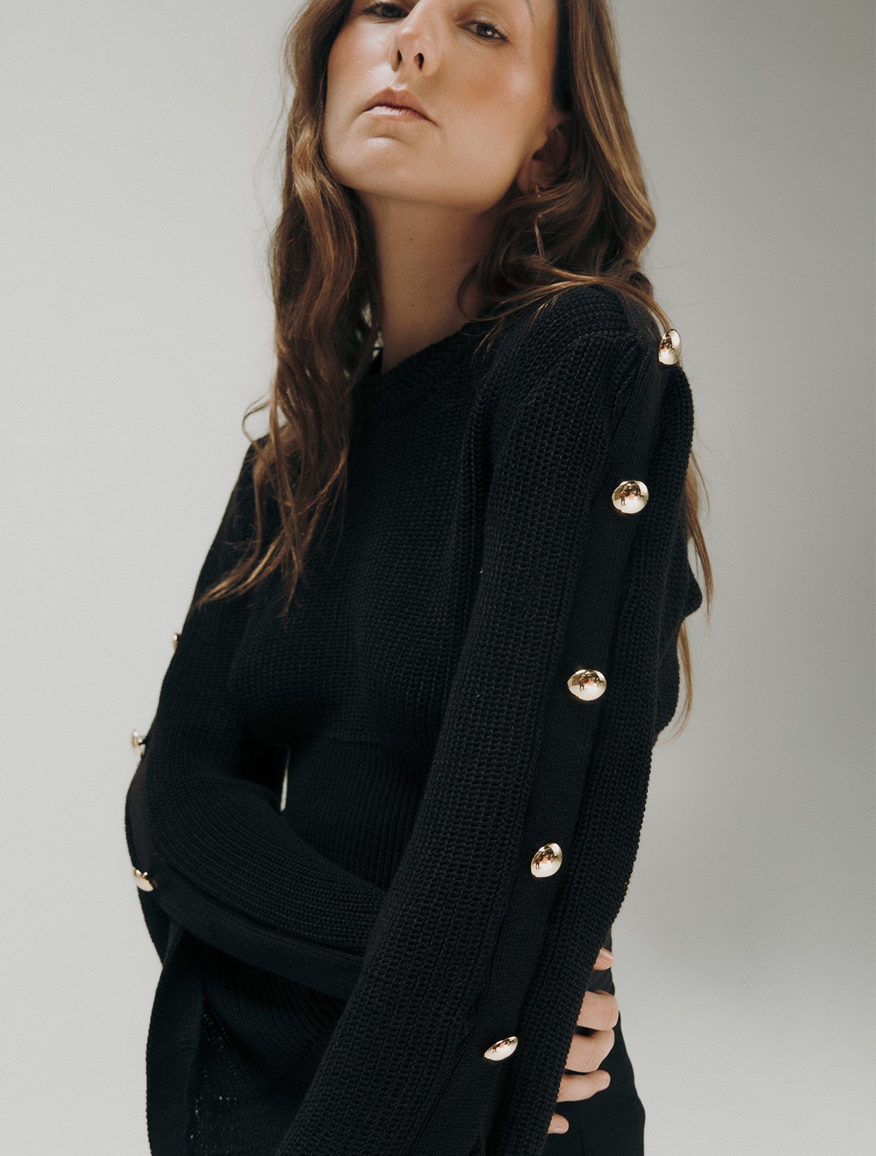 Saco tejido con escote redondo en puntada zigzag. Mangas acampanadas con botones dorados decorativos. El cuerpo combina tejido tipo rib de corte amplio con una sección entallada en la cintura trabajada en punto más ceñido.
