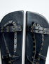Sandalia compuesta por múltiples tiras finas de cuero paralelas. Estas tiras están adornadas con ojetes o remaches metálicos a lo largo, dándole un toque vanguardista o rockero. La puntera de la suela es ancha y redondeada.