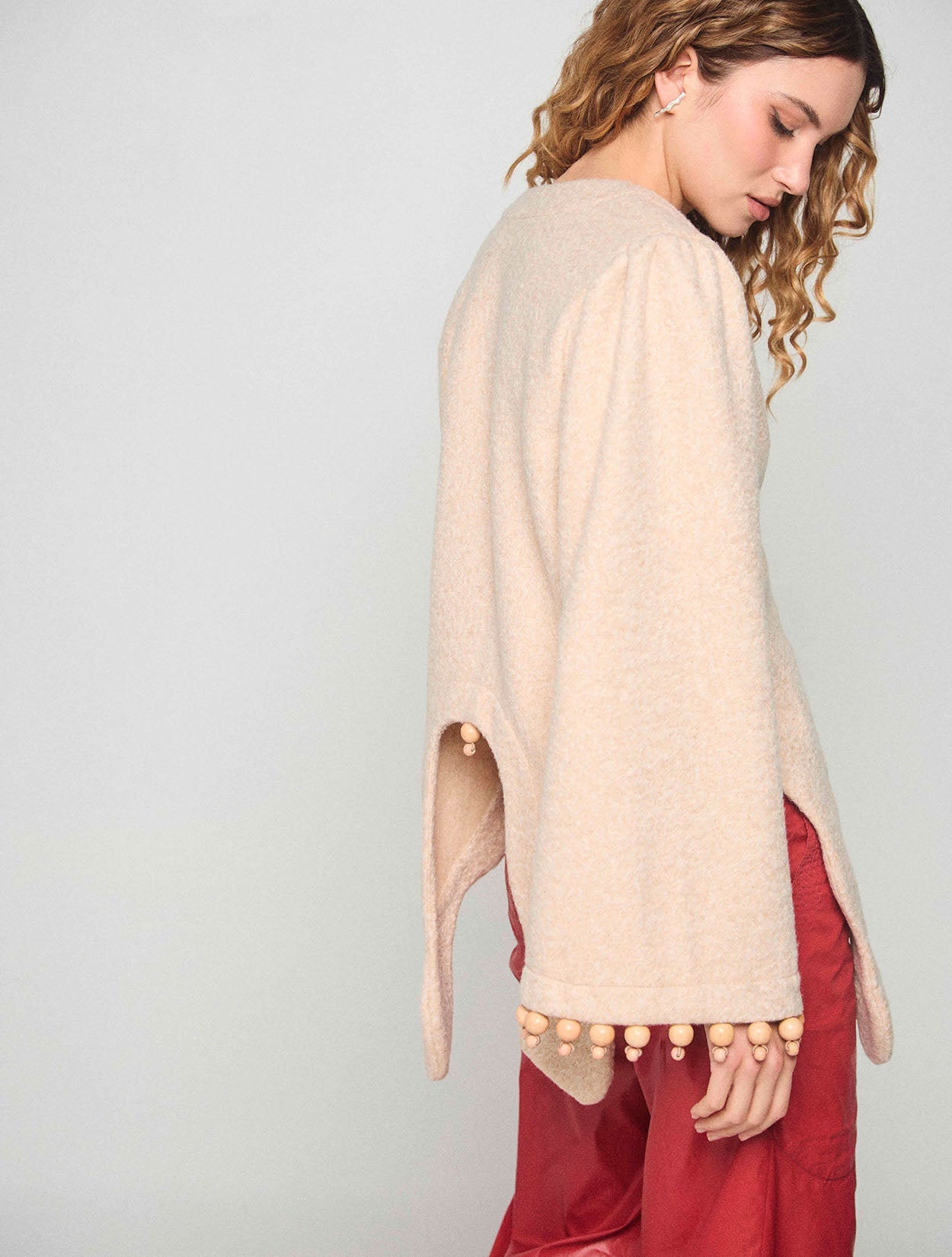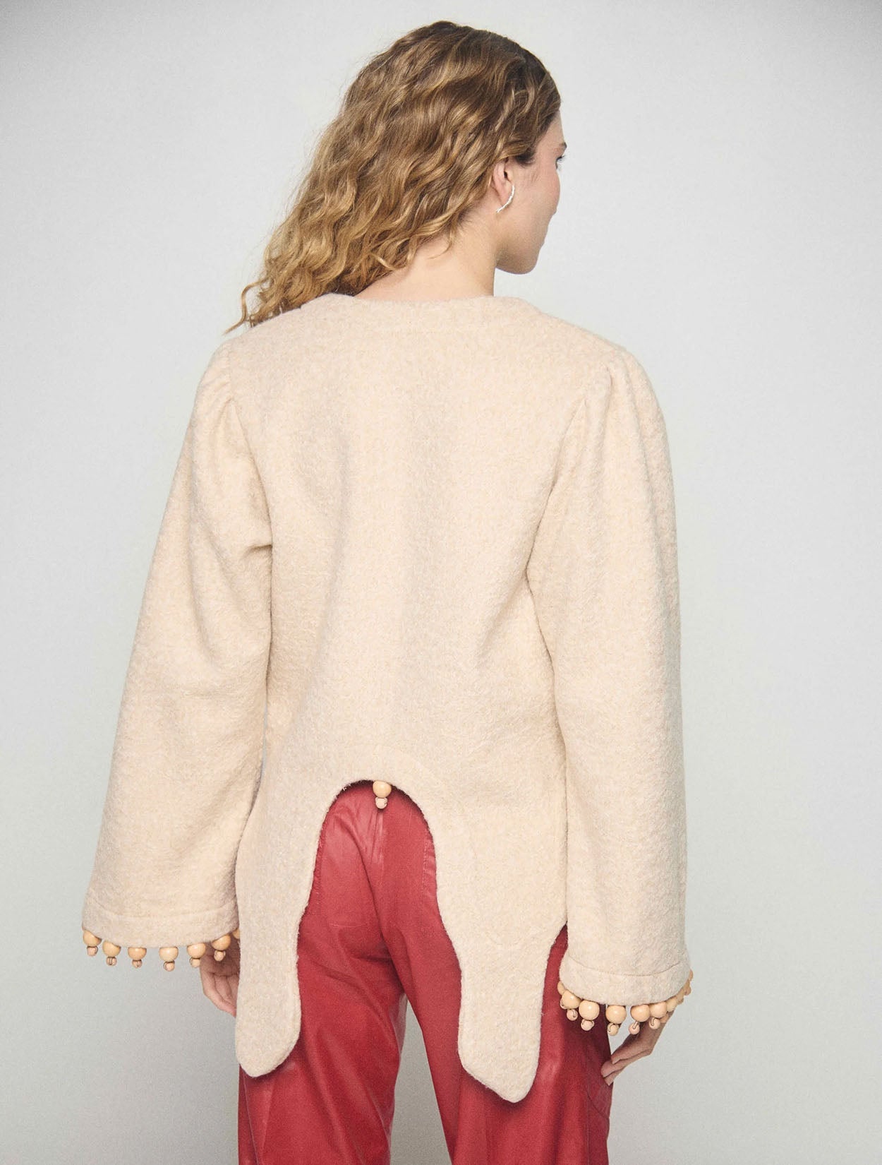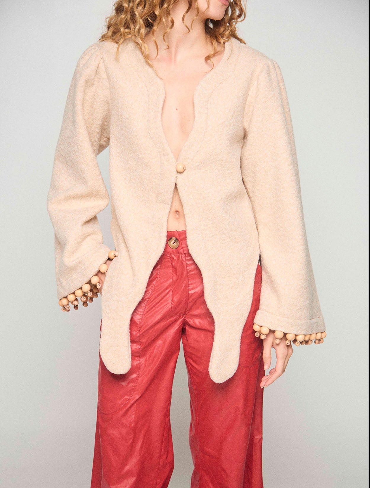 La silueta es muy Zierra Leona: formas onduladas que reemplazan el clásico corte recto, creando movimiento y un efecto visual precioso en el cuerpo. El frente se cierra con un botón en madera y las mangas terminan con nuestro detalle artesanal de esferas, agregando textura, diseño y personalidad.