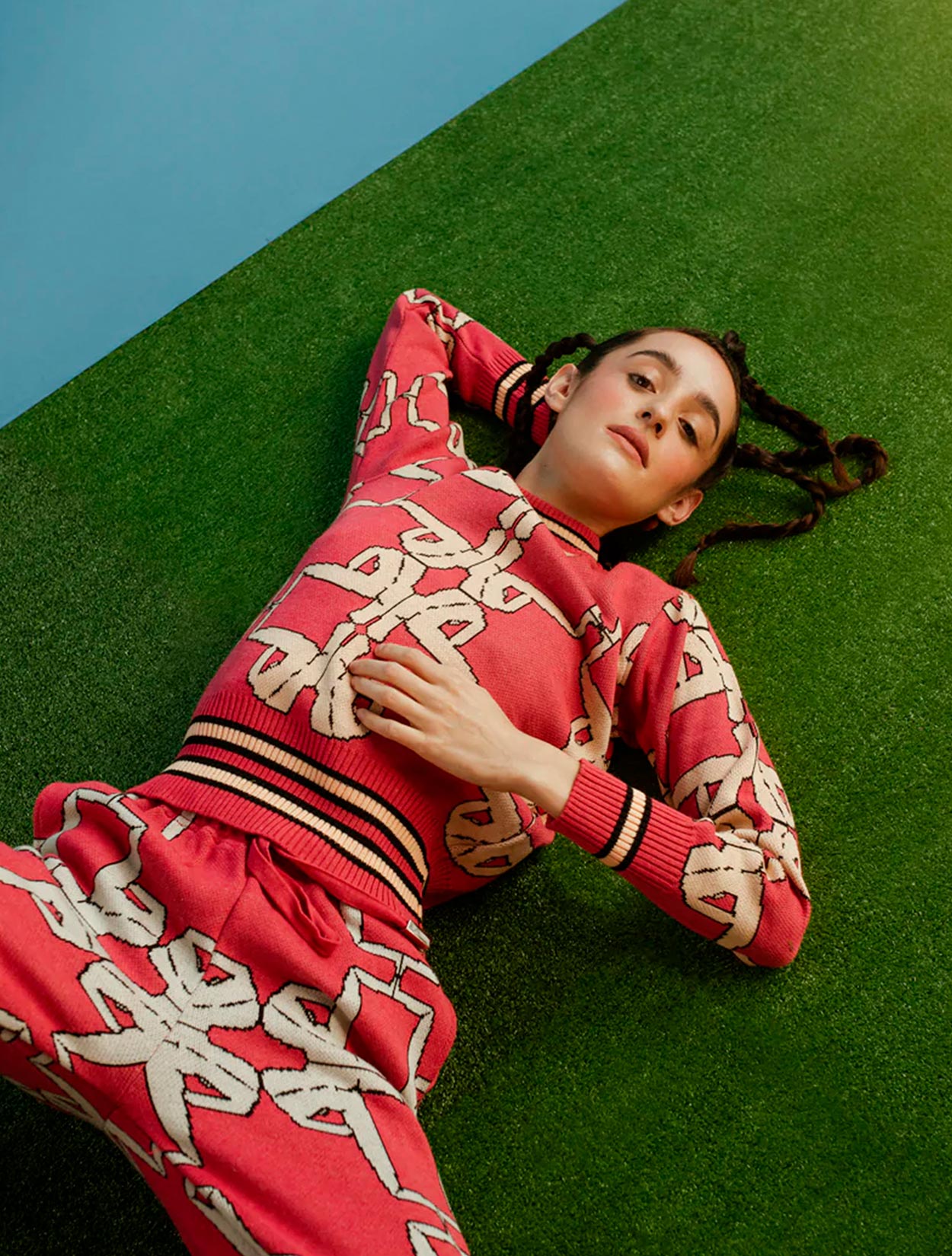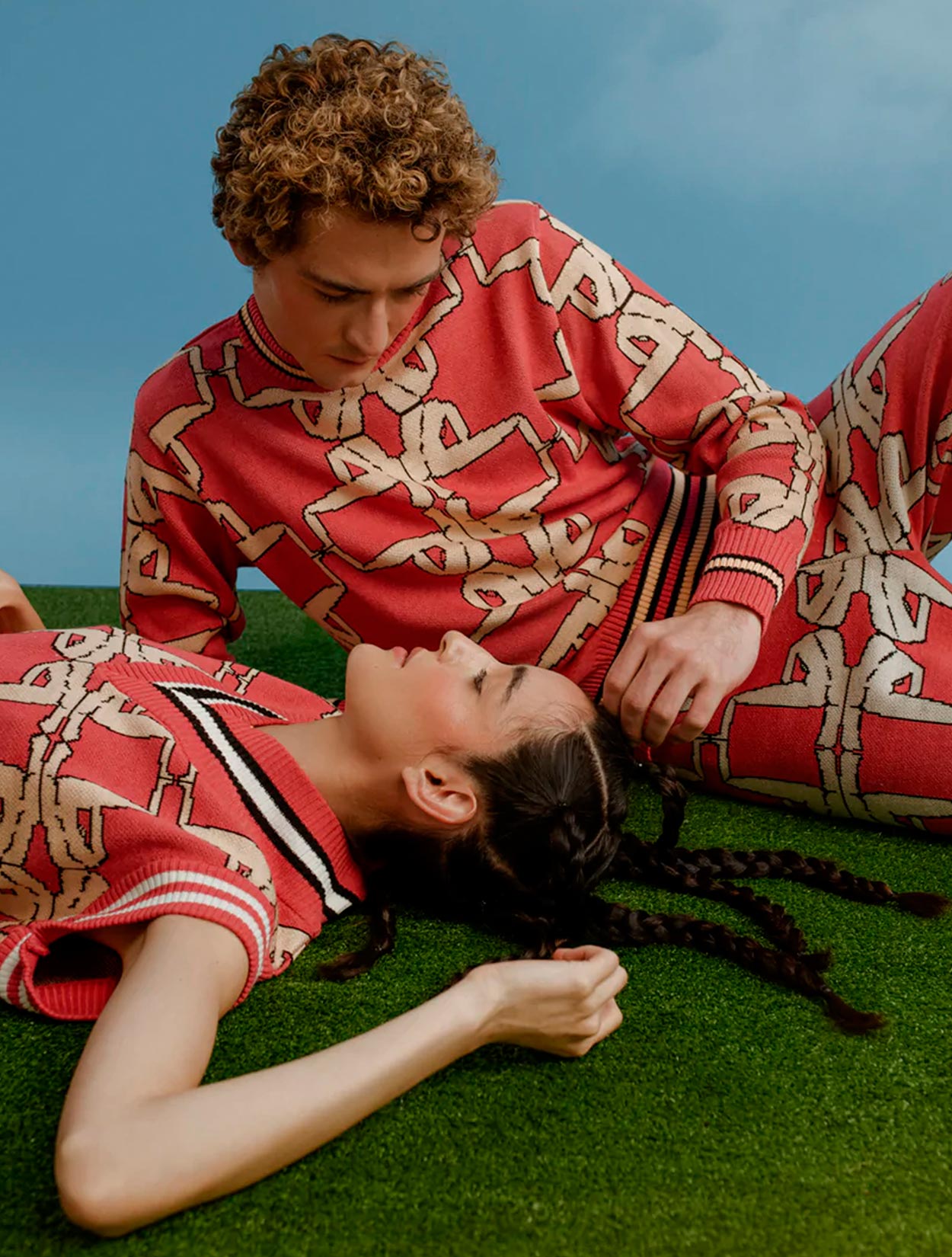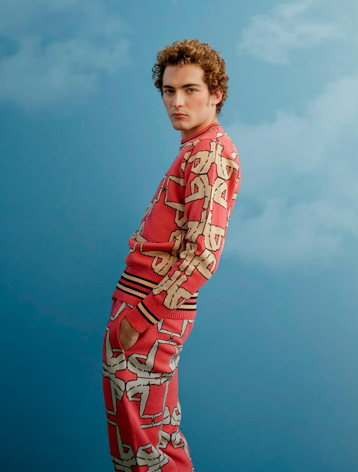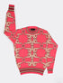 Este es un suéter de corte clásico ( cuello redondo o cuello redondo) y manga larga, caracterizado por su color intenso y un patrón gráfico repetitivo que lo convierte en una pieza de arte urbano.
