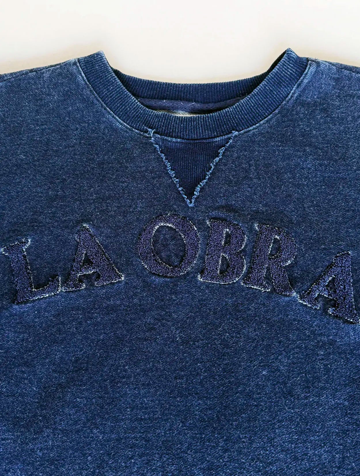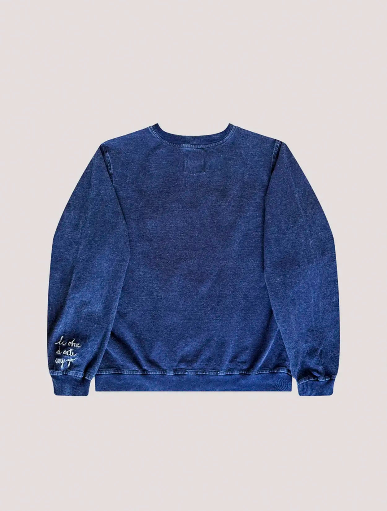 Sweatshirt de cuello redondo, confeccionada en burda 100% algodón, con lavado acid wash azul y bordado en chenille. silueta clásica.