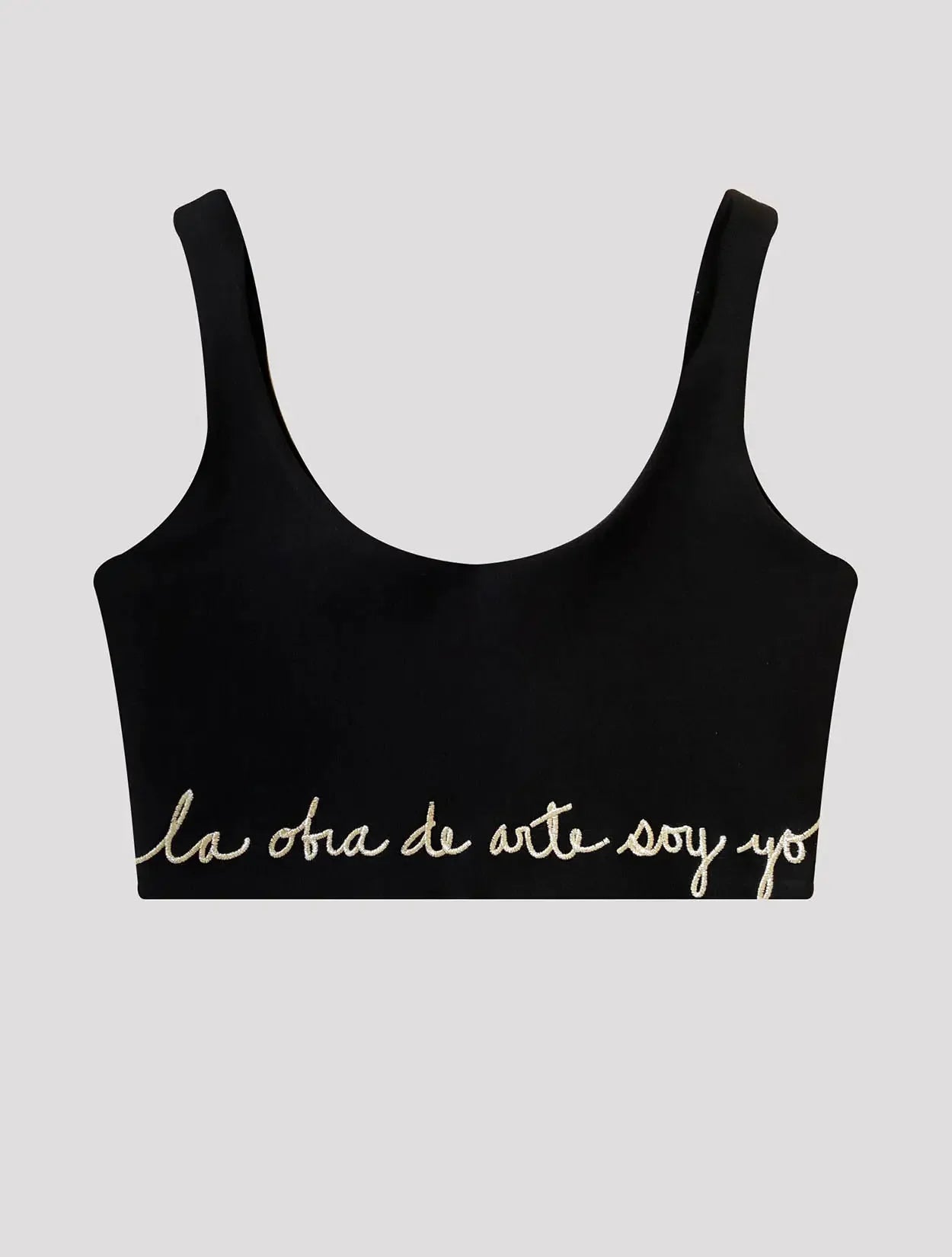 Top clásico negro, silueta ajustada en tejido punto de roma 100% poliéster, con bordado en parte inferior.