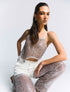 El Top Caimara Sparkle es un crop top de tirantes finos que destaca por su tejido de malla metalizada y su corte asimétrico en el bajo, que aporta un movimiento fluido y un aire futurista. Es la prenda perfecta para brillar con luz propia.