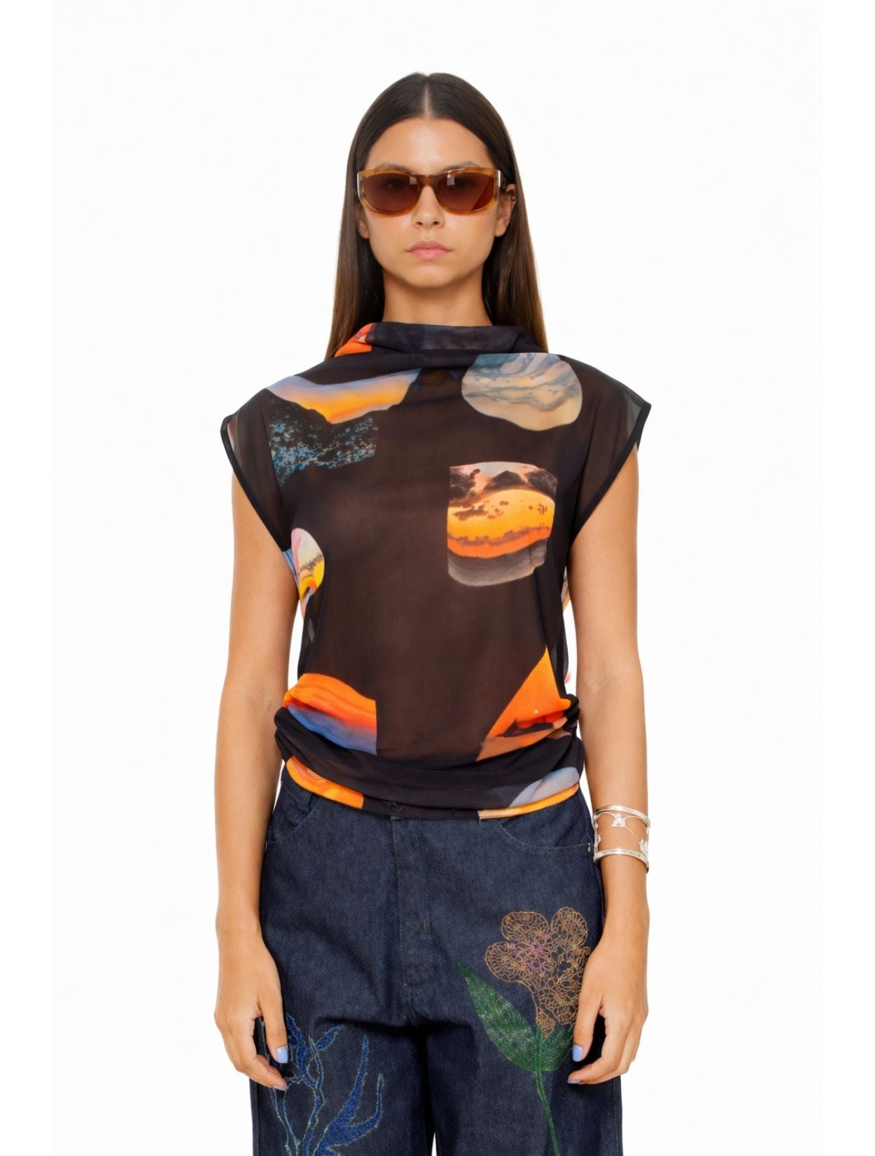 Confeccionado en una malla ligera y traslúcida , destaca por su cómodo cuello tipo embudo y un corte sin mangas que aporta frescura y elegancia. El estampado presenta cuadros gráficos de paisajes en tonos naranja y ocre sobre un fondo negro profundo, creando un contraste visual moderno y de alto impacto.