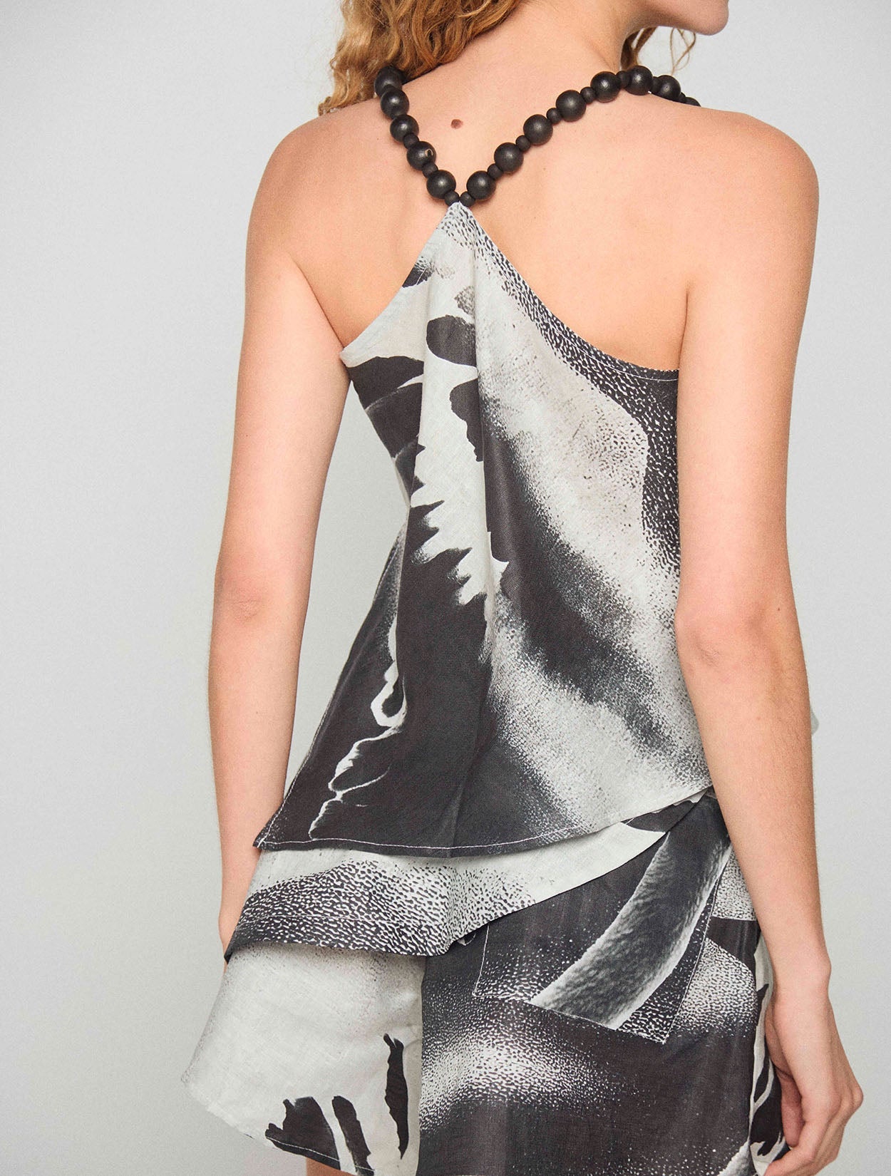 El Eterna Top es una pieza ligera, fresca y visualmente poderosa. Confeccionado en 100% lino, su textura natural permite una caída suave y orgánica, perfecta para el clima cálido y para viajar con estilo. Su print en blanco y negro —uno de los códigos más versátiles y atemporales— hace que se combine fácilmente con cualquier prenda, desde denim hasta pantalones neutros o colores vibrantes. Su diseño incluye una caída diagonal que favorece la silueta, estiliza visualmente la cintura y aporta movimiento. Además, puedes ajustarlo y amarrarlo al lateral para transformarlo en una versión más corta, creando dos estilos en una sola pieza.