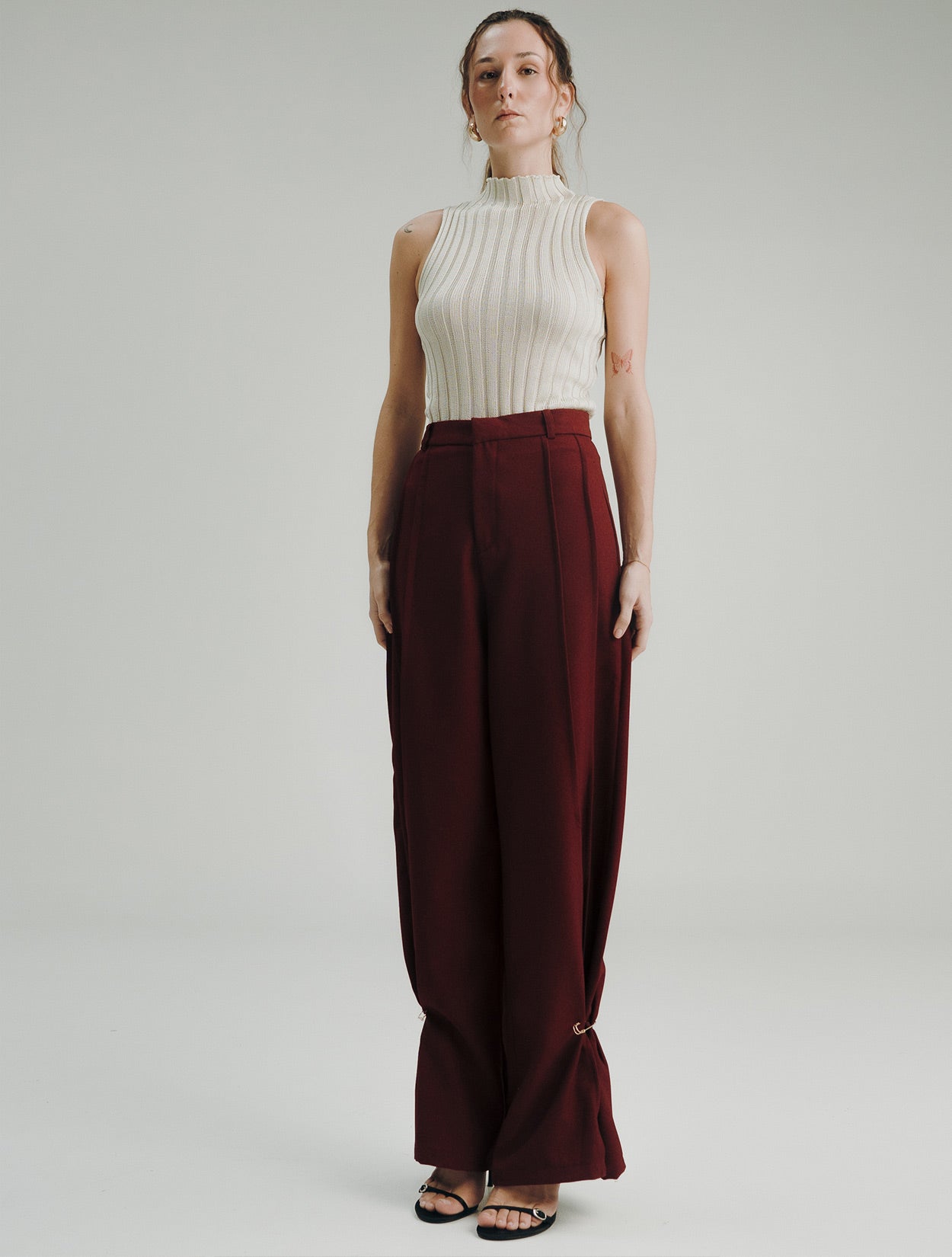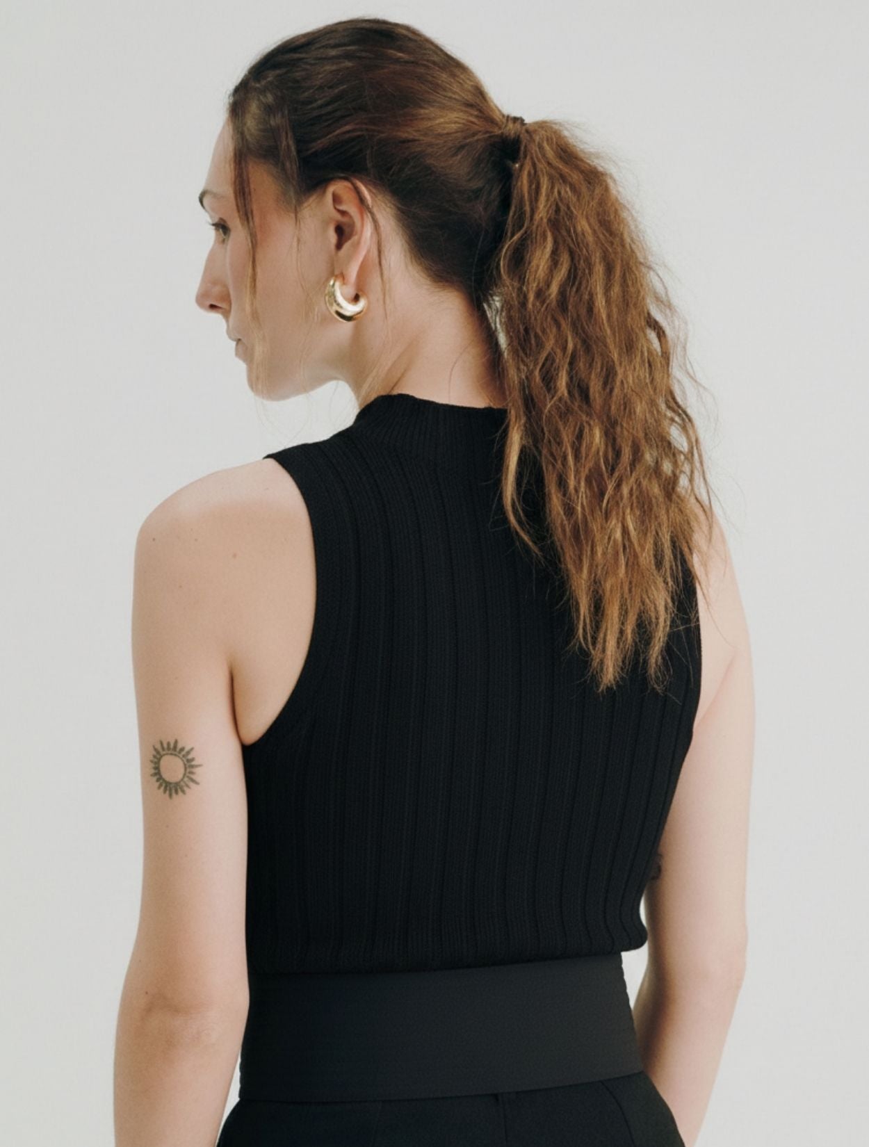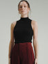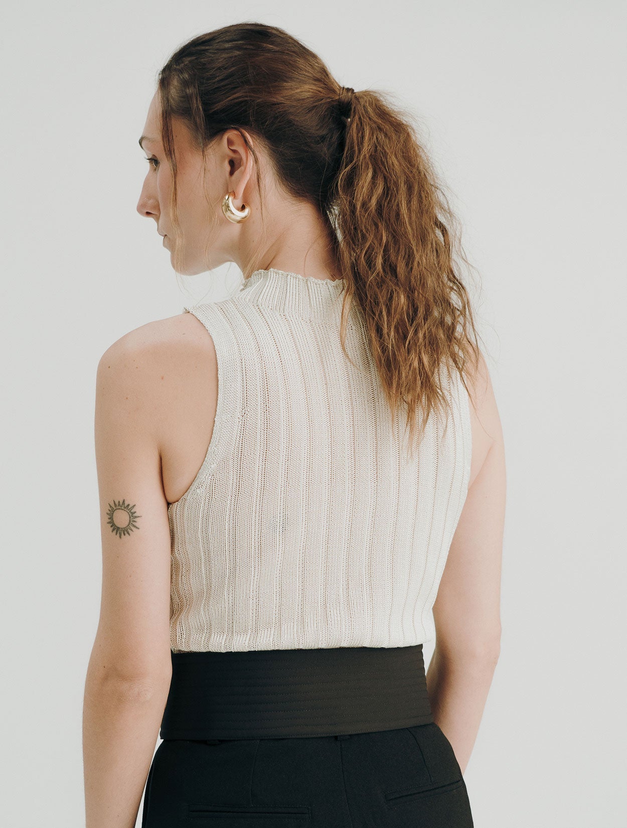 Top esqueleto tejido en hilo de seda con puntada tipo rib. Diseño de cuello alto con terminaciones arandeleadas en cuello y ruedo. Largo hasta debajo de la cintura.