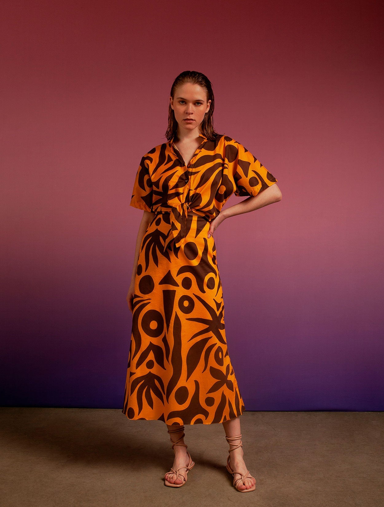 Top de estilo veraniego, con un diseño que destaca por su vibrante paleta de colores y su estampado abstracto de inspiración tribal.