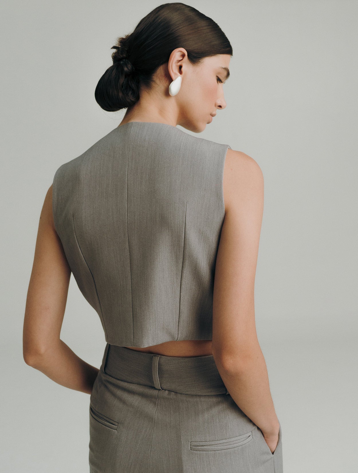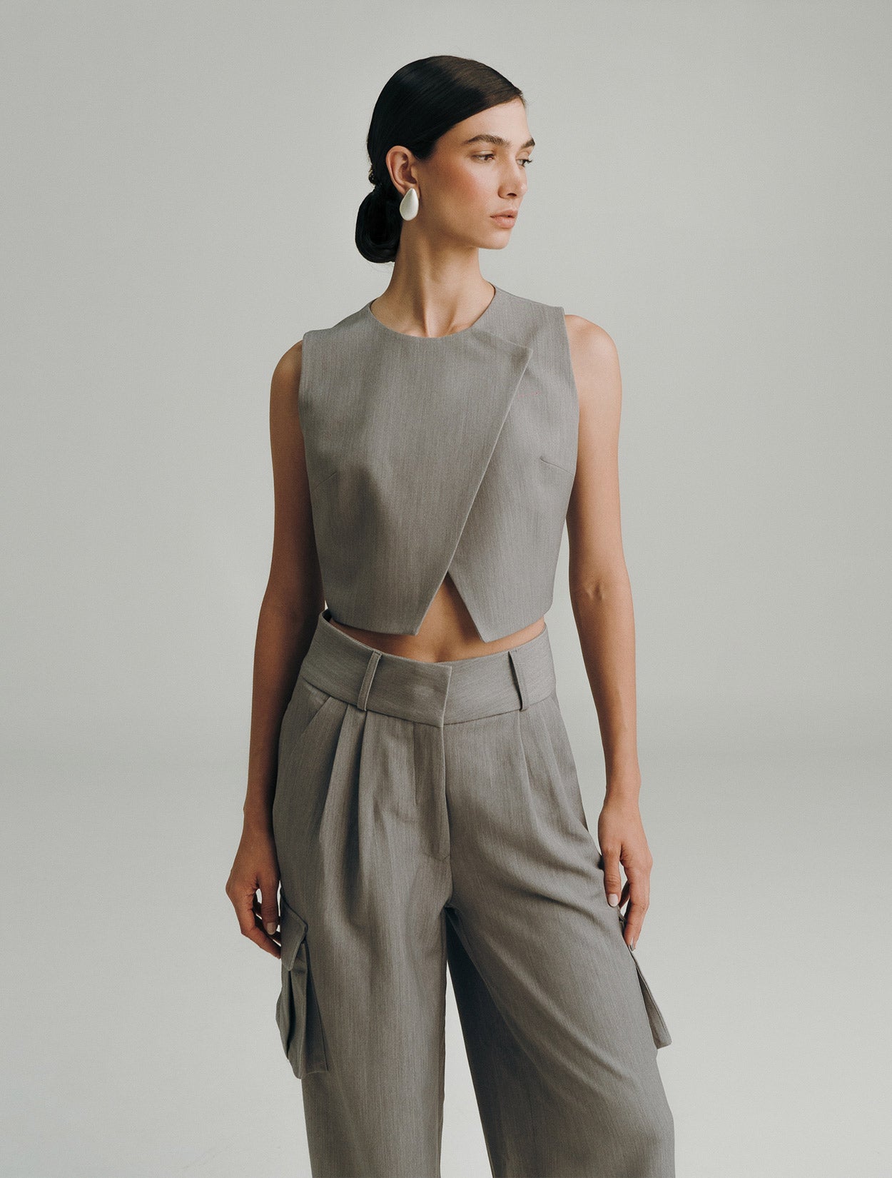 Top estructurado que destaca por su corte asimétrico y detalles únicos. Este chaleco cropped es una pieza statement que aporta sofisticación y modernidad a cualquier look. Su diseño de corte cruzado revela sutilmente la cintura, creando una silueta estilizada. Combínalo con el pantalón sidney.