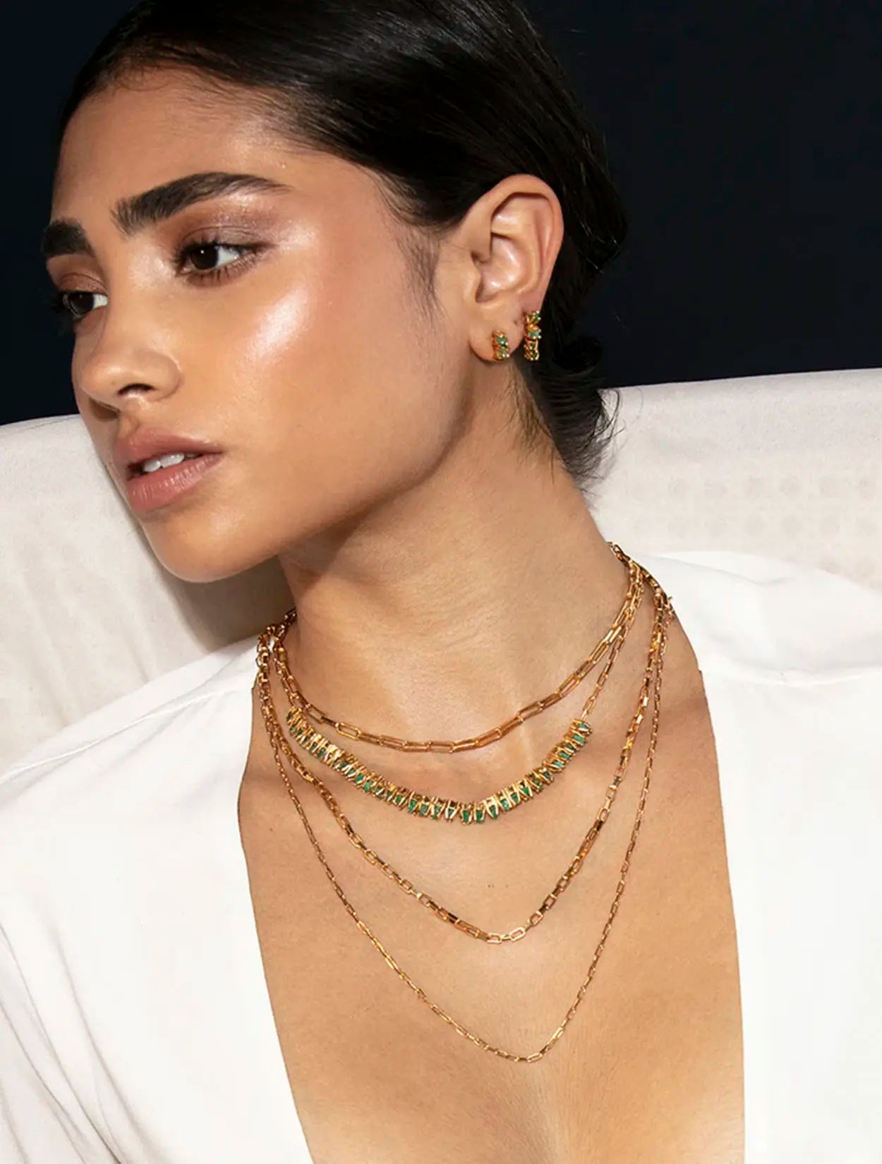 Topos pequeños con engaste de 3 esmeraldas en bruto, hechos a mano en bronce con baño de oro de 24 quilates.