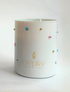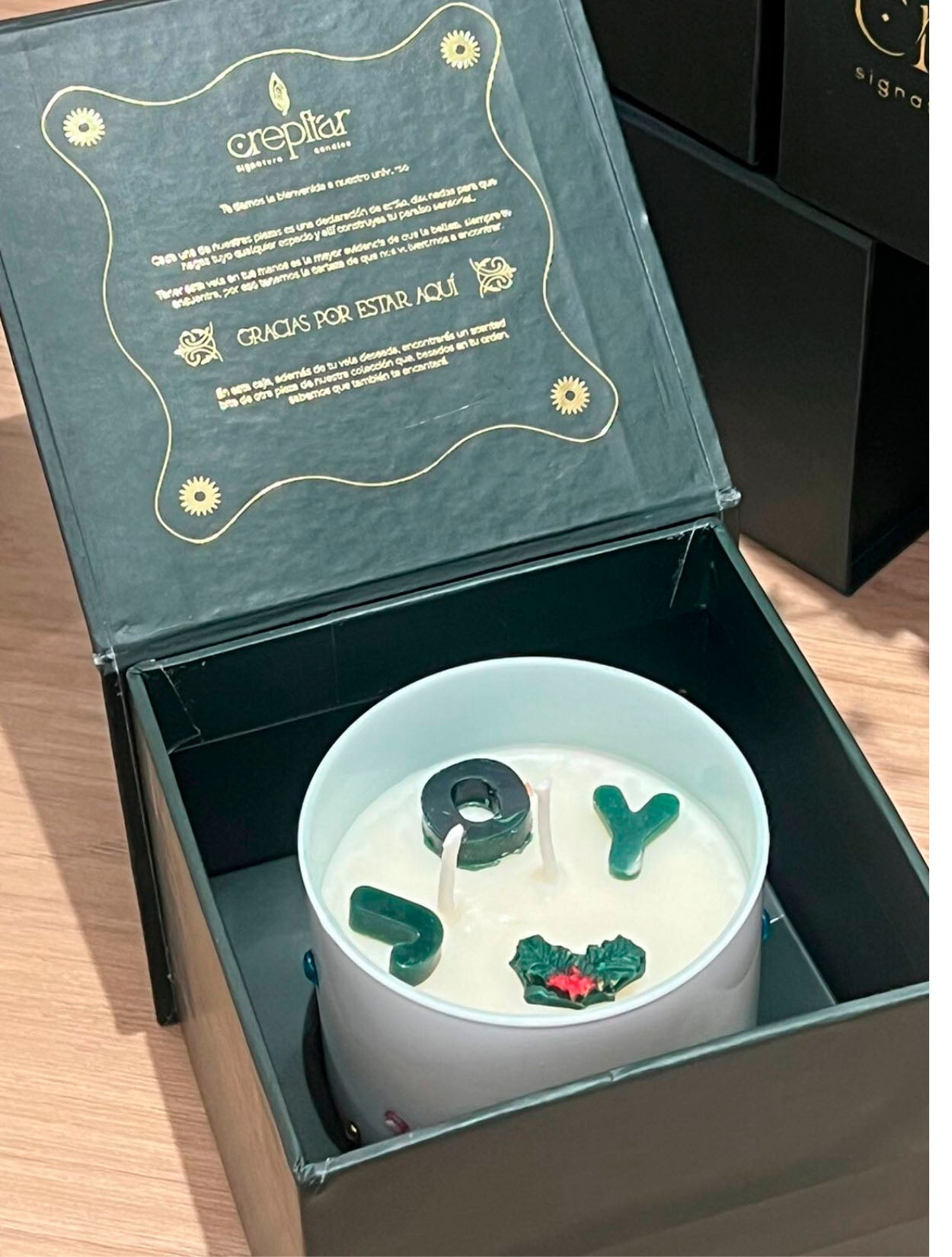 Inspirada en los colores de faroles y velas del 7 de diciembre y los alumbrados de navidad, tiene incrustaciones de perlas de colores que se mezclan con la sobriedad del envase blanco.