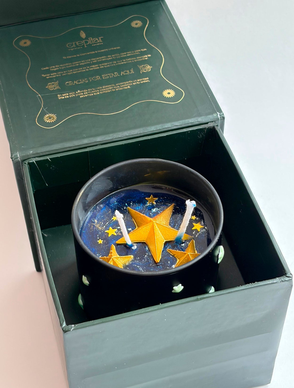 Tiene una fina capa de gel que le da el efecto galaxia en la superficie y tiene 10 estrellas incrustadas que brillan en la oscuridad para representar el cielo estrellado de diciembre.