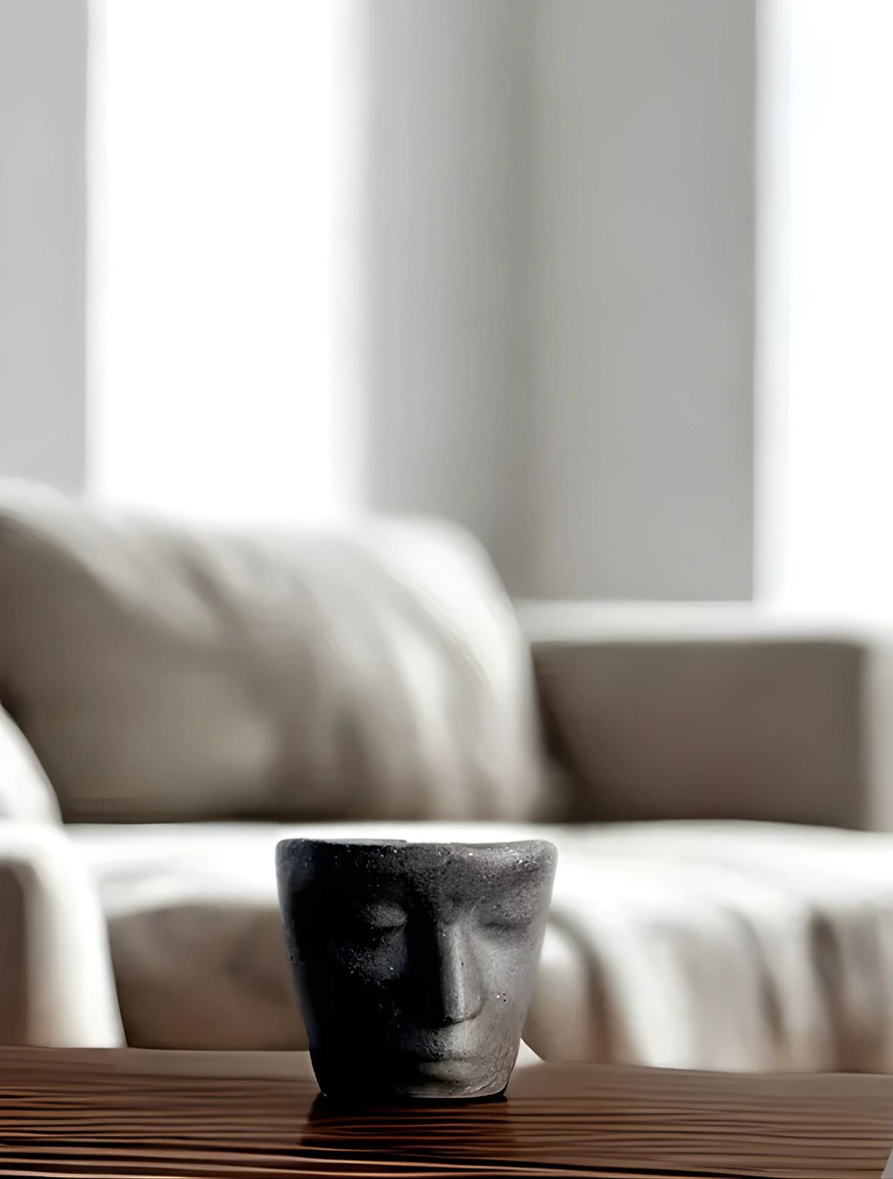 - Diseño escultórico de cara humana que funciona como elemento decorativo.