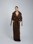 Vestido largo tipo abrigo en gamuza café, con cinturón, bordado de pedrería en la parte delantera, posterior y mangas, recogido en puño para dar volumen, con cuello sastre.