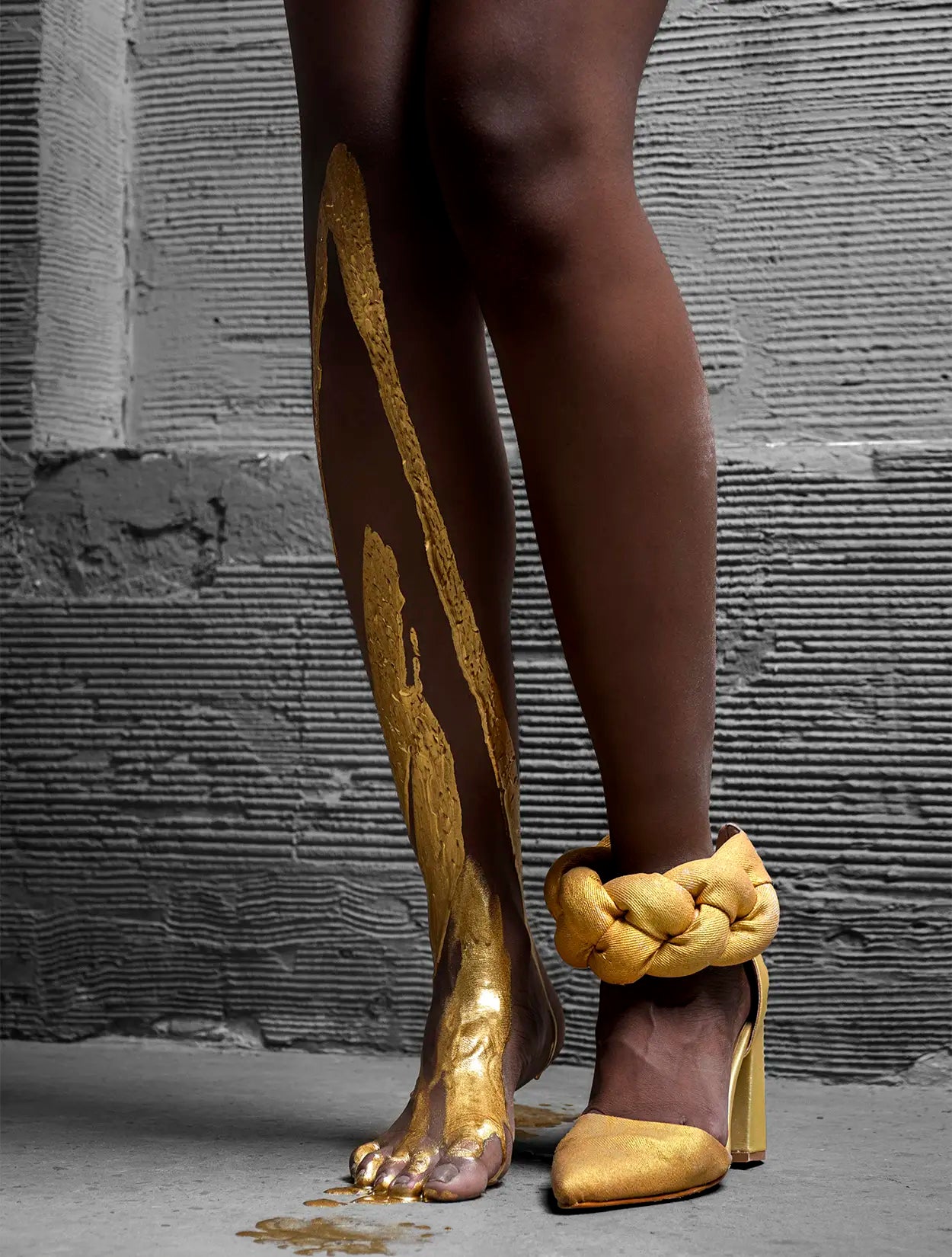 Eleva tu estilo con el tacón AURUM, una pieza escultural en un vibrante tono dorado. Su distintivo es el diseño trenzado XL que envuelve el tobillo, fusionando la silueta de un stiletto clásico con un toque de artewear audaz y contemporáneo.
