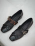 Silueta clásica de bailarina con punta cuadrada moderna. El detalle distintivo es el lazo pequeño en la puntera y la correa doble de empeine, una de ellas de piel negra y la otra con un estampado de animal print, ambas cerradas con hebillas metálicas.