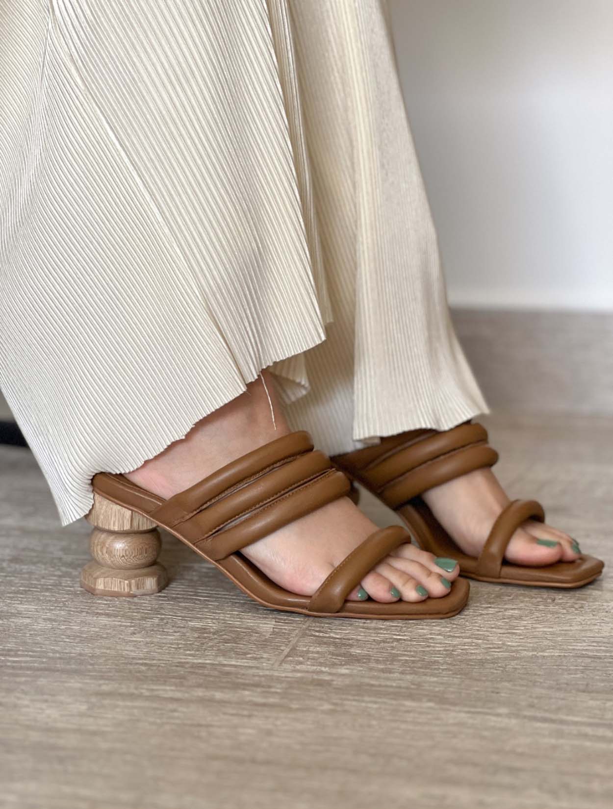 La pala está formada por dos o tres tiras voluminosas y acolchadas de estilo puffy, que cruzan el empeine. El tacón es de diseño cilíndrico o de bloque, esculpido con un patrón de anillos/madera (simulando madera torneada). Puntera ligeramente cuadrada.