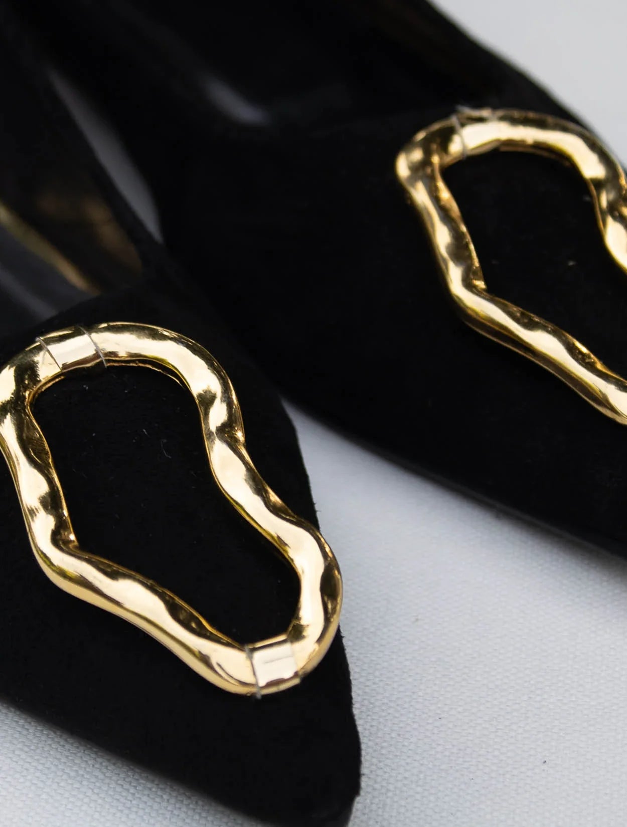 Elegancia contemporánea: punta fina en gamuza burdeos y herraje escultórico dorado que convierte estos pisos en una joya para tus looks diarios.
